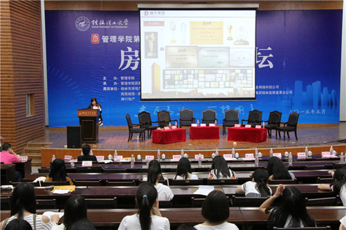 为贯彻落实学校第二次党代会提出的“着力推进人才培养模式转变,全面提升教育教学质量和办学水平”重要精神,通过进一步整合社会资源,搭建校企沟通合作平台,有效推进专业改革和学院学风建设内涵式发展,为学院学生学习、就业提供全面有效的服务,2015年5月23日下午,管理学院在屏风校区图书馆报告厅隆重举行第五届“商学期”系列活动之“房地产论坛”。学院党委书记白永生、桂林房地产协会会长申应林以及来自房地产行业的12家企业嘉宾出席了本次论坛。 本次论坛活动分为“新常态O2O模式对桂林房地产的影响” 房地产论坛、“产学研用联动人才培养机制研讨”以及“房地产专业专场招聘会”等三个环节。为了使广大房地产经营与管理专业学生掌握房地产行业未来的发展趋势,明确就业方向和实践能力,提高个人专业素养和就业竞争力,管理学院党委书记白永生在第一个环节的开场致辞中提出,希望通过本次论坛,学院与企业嘉宾、老师和同学们的共同探讨解决房地产专业如何走向、人才培养怎样实施,教学改革怎样推进等问题。与会嘉宾和师生首先就“新常态O2O模式下对桂林房地产的影响”展开了激烈的讨论,企业嘉宾围绕论题各抒己见,分别从营销模式改革、国家政策预判、企业销售观念等不同方面进行了深层次的分析,认为新常态O2O模式下桂林房地产是机遇与压力并存的,需要找不同的改革方法;接着与会同学就大学生专业素养提升,就业能力培养、实习实践以及创新创业等问题与在场企业嘉宾们进行了紧密的互动。第二个环节的研讨会在管理学院7206会议室举行,研讨中企业代表与房地产专业负责人就房产专业教育教学人才培养方案与市场需求对接,房产专业服务桂林市房产行业的形式,以及大学生实践能力提升等内容进行了深入讨。在专场招聘会环节房产专业未就业毕业生与桂林恒大等多家企业进行了现场应聘。 此次房地产论坛是管理学院学生活动品牌项目“商学期”的子活动。由学院团委与各教研室充分合作打造的“商学期”活动,涵盖八大项目,注重将学生理论知识学习与专业赛事相结合、把课堂教学与企业实训相结合、把学生课外实践与就业创业相结合,在合力育人方面取到了良好的效果。
