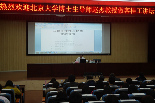 3月11日晚,北京大学博士生导师赵杰教授做客桂工讲坛,为Beat365官网师生作了题为《文化多样性与民族旅游开发》的专题报告。旅游学院相关专业师生参加了学术报告会。 报告中,赵杰教授精辟阐述了民族旅游的理论意义,说明了民族文化的多样性在一定程度上推动民族旅游的发展。随后,他用英语、韩语、日语以及我国几个少数民族的方言来诠释文化的多样性,并倡导现代导游要做到“问不倒”,要不断提升自身的文化内涵,为推动民族旅游事业发展做贡献。最后,还以生动活泼的语言一一举例以喀纳斯湖等18个著名景点为代表的我国著名旅游景区的民族文化,强调民族文化在旅游事业发展中的重要作用。赵杰教授深入浅出的授课方式,赢得台下师生的阵阵掌声,师生们感觉收获颇丰。报告结束后,赵杰教授还与师生们就感兴趣的问题进行了互动交流。