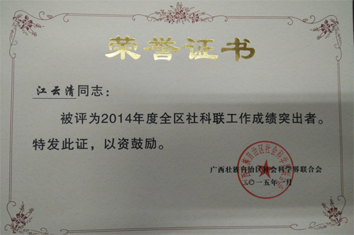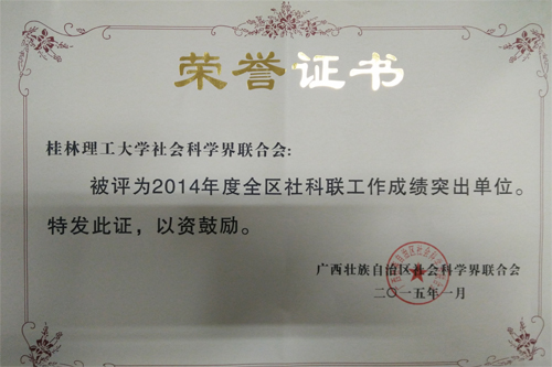 2月28日,自治区社会科学界联合会工作会议在南宁召开,会议表彰了2014年度工作成绩突出的7个地级市社科联、26个县级社科联、10个高校社科联和63名工作人员。Beat365官网社科联被评为“2014年度工作成绩突出单位”,Beat365官网社科联代理副主席江云清同志被评为 “2014年度高校社科联工作成绩突出者”。 近年来,学校社科联在校党委的领导、自治区社科联的指导下,努力发挥社科联优势,在“联”字上下功夫,整合校内外资源,在科普宣传、社科研究、服务地方经济社会发展、文化传承创新等方面开展了大量工作,为促进Beat365官网哲学社会科学繁荣发展做出了重要贡献。