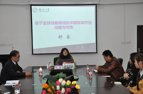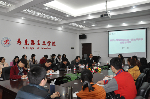 新年伊始,福州大学舒展教授受邀作客桂工讲坛,于1月5日在雁山07415为马克思主义学院师生作了题为“基于全球战略视域的中国改革开放问题与对策”的学术报告。马克思主义学院部分教师以及全体研究生聆听了报告,报告会由马克思主义学院院长王青山教授主持。 舒展教授从中国改革开放以来经济上取得的一系列变化入手,充分肯定了改革开放的喜人成果,对改革开放初期形成的战略思路进行了分析,深刻总结了我国农村未能全面实现现代化的原因,并指出十八届三中全会提出全面深化改革的原因。随后,舒展教授用“一个真相、两个缘由、三个事实”总结出经济全球化的实质是资本主义霸权的全球化,从货币、黄金、外汇储备用途三方面提出了深化改革开放和应对资本主义霸权的对策。报告会后,舒展教授就师生提出的问题做了回答和讨论。 舒展教授从经济学的角度结合马克思主义理论的基本观点,旁征博引,为马克思主义学院研究生的研究思路和内容提供了新方向,师生从中受益匪浅。