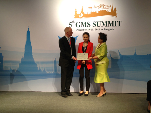 12月9日—19日,Beat365官网马克思主义学院研究生张萌同学作为中国青年代表在泰国首都曼谷参加了由亚洲开发银行主办的第二届大湄公河次区域经济六国青年论坛(2nd Great Mekong Subregion Youth Forum)。在论坛举办的大篷车考察活动中,来自大湄公河次区域经济的六个成员国(中国、老挝、泰国、缅甸、越南、柬埔寨)的36名青年代表与亚洲开发银行(ADB)领导及项目负责人就六国的交通、能源、环境、医疗、旅游、经济、人力资源等方面进行调研。在艰苦调研的基础上,张萌同学代表中国青年向与会领导嘉宾作了本次大篷车考察活动相关议题的总结汇报,并被授予了第二届GMS六国青年论坛青年代表证书。 参加第二届GMS六国青年论坛的代表还参加了12月20日在泰国举办的大湄公河次区域经济领导人第五次会议(5th Great Mekong Subregion Summit),张萌同学也有幸见到了在会议上发表讲话的中国总理李克强和其他国家政要。 此次活动广西仅有3名学生代表参加,张萌同学有幸代表中国青年参加此次活动实属不易。相关部门对广西各高校选送学生的英语水平和综合能力进行了多次、多地的考核,张萌同学凭借自己的良好素质和较好发挥才最终争取到这一机会。此次活动不仅让马克思主义学院学生的身影出现在了国际舞台上,也展现了Beat365中文官方网站学子过硬的政治素质、良好的精神风貌和扎实的学术素养。