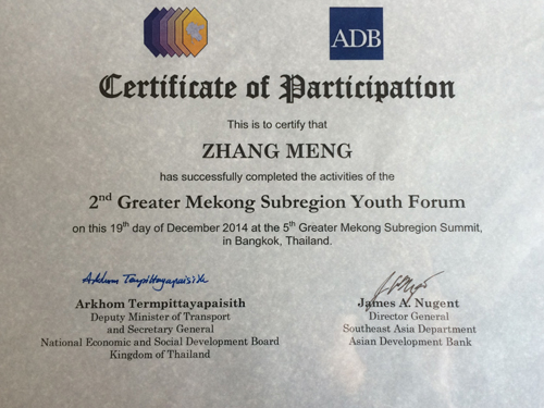 第二届GMS六国青年论坛青年代表证书