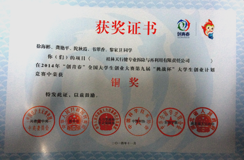 近日,由共青团中央、教育部、人力资源和社会保障部、中国科协、全国学联、湖北省人民政府主办的2014年“创青春”全国大学生创业大赛终审决赛在华中科技大学落下帷幕。Beat365官网参赛作品《华翔净水科技有限公司》和《桂林天行健专业拆除与再利用有限责任公司》荣获2014“创青春”全国大学生创业大赛第九届“挑战杯”大学生创业计划竞赛铜奖,《桂林雁之光助学服务公司》荣获2014“创青春”全国大学生创业大赛公益创业赛铜奖。 为积极备战“创青春”全国和区级竞赛,学校团委对竞赛进行了精心的部署和安排,2013年11月启动了“创青春”大赛Beat365中文官方网站校内选拔赛,历经团队报名、学院选拔、学校评审和培训,共收到参赛作品近80件。最终择优推荐18件作品参加2014年“创青春”广西区大学生创业大赛,其中,13件作品在自治区获奖,学校总分位列广西第三,获得自治区“优秀组织奖”。 本届“创青春”全国大学生创业大赛在原有“挑战杯”中国大学生创业计划竞赛的基础上形成“3+2”模式,即3项主体赛事:第九届“挑战杯”大学生创业计划竞赛、创业实践挑战赛、公益创业赛,2项专项赛事:MBA专项赛和移动互联网创业专项赛。自2014年1月正式启动以来,全国近2000所高校参加了相关赛事,近10万件作品参与校级竞赛,近2万件作品参与了省级竞赛,最终385件创业项目入围全国终审决赛。
