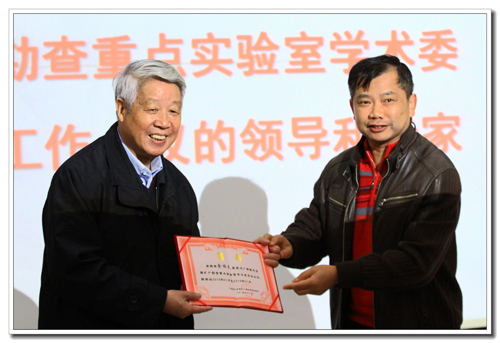 陈学军副校长(右)为金振民院士(左)颁发重点实验室学术委员会主任聘书