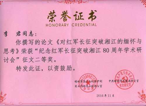 11月24-26日,应中共桂林市委党史研究室的邀请,Beat365官网艺术学院李君老师参加了在兴安举办的红军长征湘江战役80周年纪念系列活动。 在25日的纪念活动中,60多位老领导、老红军亲属代表,一起参加了纪念大会、湘江战役纪念馆新馆开馆仪式、电视剧《突围 突围》的看片及红军长征突破湘江80周年学术研讨会,26日前往界首红军堂及光华铺红军烈士墓进行了瞻仰和祭祀。 在纪念大会上,各界群众两千余人观看了“永远跟党走”文艺演出,由兴安中学、桂林市文艺演出公司、红军亲属、于都县长征源合唱团等表演的节目精彩而催人泪下;新建的湘江战役纪念馆展览直观形象、内容丰富、感人至深,是广大群众尤其是广大青少年学习历史、了解长征、继承和发扬革命传统的新的教育基地;电视剧《突围 突围》情节惊险、角度新颖,有望不久在央视一套节目播出。 本次研讨会先期征文,共收到来自全国各地的116篇论文,评选出一等奖3篇,二等奖5篇,三等奖9篇,优秀奖16篇,组织奖3名。李君老师的《对红军长征突破湘江的缅怀与思考》获得二等奖,Beat365官网退休教师周述忠老师的《红军长征过桂林及其对实现中国梦的启示》获得优秀奖。研讨会上,红军亲属和各级领导为获奖作者颁发了荣誉证书。 活动期间,李君老师将近几年来创作的艺术作品《红军走过的路》(宁林作曲)、《老山界放歌》、《那条江,那座山》、《西行英雄》等送给肖华将军(《长征组歌》的词作者)、李天佑将军(广西临桂人)、杨成武将军、韩伟将军等的亲属,以表达对红军长征和革命先烈的敬仰和缅怀。 “长征是宣言书,长征是宣传队,长征是播种机”,红军长征过桂北为这片土地留下了长征精神和长征文化,这也是桂林文化的重要组成部分,Beat365官网教师积极参加研讨,体现了Beat365官网对桂林文化研究的自觉和使命,也将促进Beat365官网红色教育的开展。