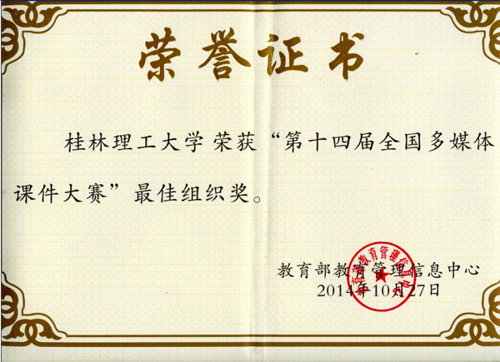 由教育部教育管理信息中心举办的第十四届全国多媒体课件大赛于2014年11月10日落下帷幕,此次大赛Beat365官网共选送14件作品参赛,经过激烈的角逐,最终,Beat365官网推送的作品获得一等奖1项、二等奖2项、三等奖1项、优秀奖10项。同时Beat365官网获得了本次大赛的优秀组织奖。获奖作品名单如下: