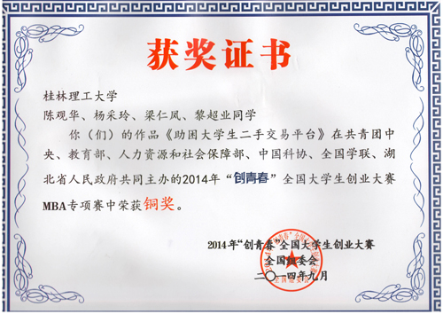 9月24日至27日,由共青团中央、教育部、人力资源和社会保障部、中国科协、全国学联和湖北省人民政府联合主办的2014“创青春”中国大学生创业大赛MBA专项赛在湖北襄阳举行。由汪晟和黄梅芳老师共同指导,管理学院黎超业和人文社会科学学院陈观华、杨采玲、梁仁凤同学完成的项目《助困大学生二手交易平台》荣获大赛铜奖。 此次MBA专项赛历时7个月,大赛突出新观念、新视野、新平台的理念,实践特色浓厚,贴近经济业态和商业模式演进的前沿,吸引了全国设有MBA专业的237所高校全部参与。经过初赛,101支队伍入围决赛。经过书面评审、团队答辩、专家问辨等环节,最终评出金、银、铜奖。整个赛事按照“7+1”的模式开展,除终审决赛外,配套设计了“隆中对”创新创业论坛暨MBA群英汇,创业人才政策及投资环境推介会等系列活动。