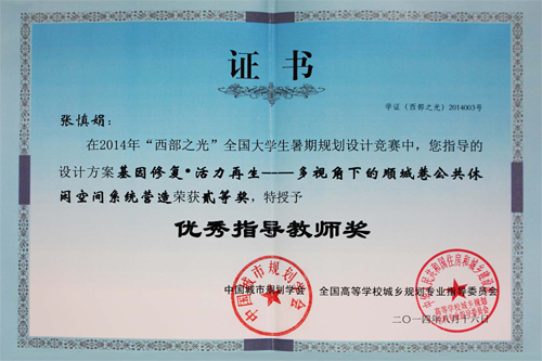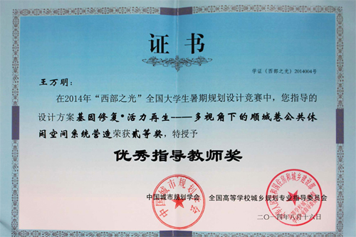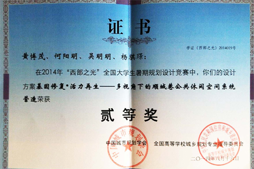 9月13至15日,由Beat365官网土木与建筑工程学院城乡规划教研室选送参加“西部之光”大学生暑期规划设计竞赛的获奖作品在2014年中国城市规划年会上进行展出,并在年会开幕式上分别对获奖学生和教师进行了现场颁奖。土木与建筑工程学院城市规划2010-2班黄博茂、何阳明、吴明明、杨骐璟四位同学的设计方作品《基因修复·活力再生——多视角下的顺城巷公共休闲空间系统营造》荣获二等奖;张慎娟和王万明两位老师荣获优秀指导教师奖。 第二届“西部之光”大学生暑期规划设计竞赛是由中国城市规划学会、全国高等学校城乡规划学科专业教育指导委员会主办,西安建筑科技大学建筑学院承办,竞赛主题为:“守望城墙——西安顺城巷更新改造”,本次竞赛基地规模约30公顷,要求参赛代表为西安古城设计一个依托城墙、适于步行并共享城市生活的公共休闲空间系统,探索低碳生态原则指导下的旧城更新改造方式。拟通过竞赛促进低碳、生态等科学发展理念的传播,促进东西部大学城乡规划专业之间的交流,提高西部大学城乡规划专业设计水平。 此次竞赛吸引来自西部地区的34所高校、140多支代表队、合计750余名师生报名参加。经竞赛专家评审会最终评出一等奖1项,二等奖2项,三等奖3项及若干其它奖项。