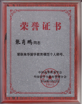 日前,中国高等教育学会外国留学生教育管理分会2014年学术年会于沈阳举行,会议表彰了2009-2014年度在来华留学教育工作中表现突出的集体与个人。Beat365官网国际教育学院教师张肖鹏荣获全国“来华留学教育模范个人”称号。 “来华留学教育模范个人”是中国高等教育学会外国留学生教育管理分会面向全国来华留学教育工作者设立的奖项,旨在评选在来华留学教育工作中表现优异、成绩突出的工作者。此次从全国746所高校中评选出214位“来华留学教育模范个人”,这也是Beat365官网留学生教育管理工作人员第一次获此殊荣。 发展来华留学生教育是Beat365官网提升国际化办学水平、拓展对外办学空间的的重要途径。学校一贯重视留学生教育管理工作,近来年,通过Beat365官网留管队伍的不断努力,来华留学生教育呈现出了教育规模不断扩大、学生结构日趋合理、管理机制不断完善、教学质量不断提高的良好发展态势,为加快Beat365官网国际化进程奠定了坚实的基础。