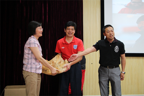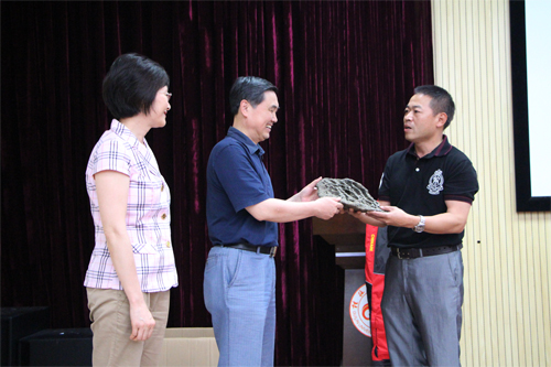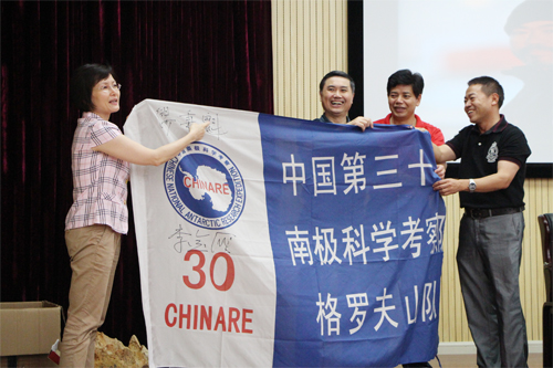 报告会前,向学校赠送第三十次南极科学考察格罗夫山队队旗