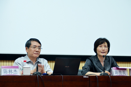 学校党委副书记、纪委书记陈贵英(右)主持报告会