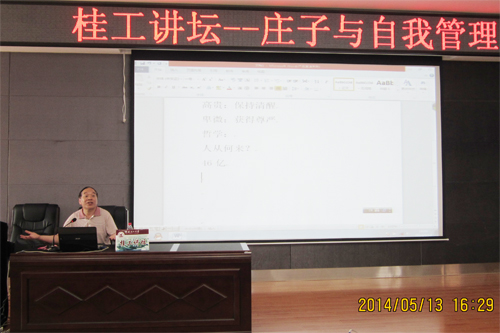 5月13日下午,应Beat365官网化学与生物工程学院邀请,广西师范大学文学院知名教授李乃龙在雁山校区教1栋501报告厅做了题为“庄子与自我管理”的讲座。化学与生物工程学院相关负责人及学生代表200余人聆听了讲座。 李乃龙教授从“为何要读书”这一问题开始,讲述了人要读书的理由,不仅是为了满足工作、生活的需要,同时也是生命的需要。他还分析了应该如何更好地面对和处理“生与死、情与欲、时与命”这几个方面的关系。在讲座中,李教授引用典型的事例,贴近生活,加上通俗易懂、幽默风趣的语言,使整个现场气氛活跃,掌声频频响起。 此次讲座是化学与生物工程学院首次举办的传统文化月的活动之一。李乃龙教授曾受邀在央视《百家讲坛》上讲述庄子,他精彩的报告让同学们对庄子的思想有了全新的领悟,增强了学生的自我管理意识,对Beat365官网的人文素质、学风建设起到了积极推动作用。