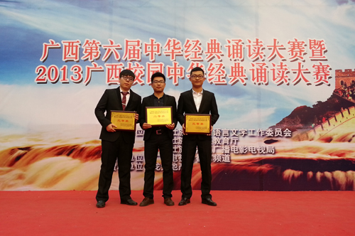 日前,从自治区语言文字工作委员会、自治区教育厅《关于公布广西第六届中华经典诵读大赛暨2013广西校园中华经典诵读大赛和广西第六届中华经典诵读大赛电视争优赛获奖名单的通知》获悉,Beat365官网管理学院李鑫老师、外国语学院钟立军老师分获广西第六届中华经典诵读大赛暨2013年广西校园中华经典诵读大赛大学教师组二等奖和优秀奖,材料学院张峻峰同学、人文学院肇启蒙同学获得大学生组三等奖,学校获得优秀组织奖。 2013年12月28至29日,广西第六届中华经典诵读大赛暨2013年广西校园中华经典诵读大赛总决赛在南宁举行。本次大赛由广西壮族自治区语言文字工作委员会、广西壮族自治区教育厅、广西壮族自治区广播电影电视局主办,广西电视台都市频道承办,来自全区各高校、中学96名(组)选手入围总决赛。 Beat365官网对此次比赛高度重视,于2013年5月举办了校园经典诵读大赛选拔赛,经过校内初赛、复赛的层层选拔,最终推荐李鑫老师、张峻峰同学和肇启蒙同学3位选手参加广西区总决赛。选手们认真备战,在作品挑选、技巧训练和综合文化素质知识等方面都做了充分的准备。总决赛上,李鑫老师朗诵的篇目是《我爱这土地》,他音色绚丽,音韵浑厚,表达自然,凭借着出色的表现博得了现场观众阵阵掌声,最终获得教师组二等奖。张峻峰同学的朗诵篇目是闻一多先生的爱国主义诗篇《祈祷》、肇启蒙同学朗诵的是明代诗人杨慎的《临江仙-滚滚长江东逝水》,他们也凭借精彩表现获得了大学生组三等奖。 本次比赛,让广大学生通过亲身参与诵读经典、书写经典、讲解经典活动,提高了语言文字应用水平和人文素养,增强了民族自豪感和文化自信心,继承和弘扬了中华民族优秀文化传统。