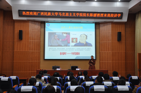 12月23日晚,应学工处和马克思主义学院的邀请,广西民族大学马克思主义学院院长陈媛教授在雁山校区12栋学术报告厅举办了 “当代人类生活:问题与变化趋势”的主题报告会。马克思主义学院王青山院长、学校各学院辅导员代表以及马克思主义学院研究生参加报告会,报告会由学工处张雷副处长主持。 陈媛教授从当代人类生活的问题、人类生活的三种基本价值、当代人类生活的审美变化趋势、构建审美生活方式四个方面进行了声情并茂的阐述,结合时事热点以及自身丰富的工作、教学、科研和生活经验,用哲学的逻辑语言讲解了对生活意义的看法和个人应如何实现自身价值追求。整场报告既有理论深度,又结合生活实际,娓娓道来中渗透着令人启发的哲学道理,使在场的师生受益匪浅。