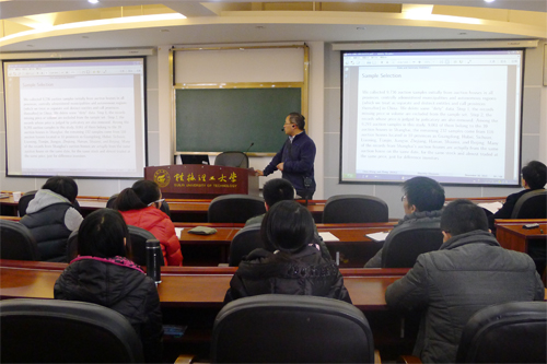 12月23日下午,中国人民大学财政金融学院博士生导师张顺明教授,应邀Beat365官网桂工讲坛,在屏风校区7307教室为Beat365官网师生作了题为《Discounts on Illiouid Stocks: Evidence from China》的学术报告。报告会由管理学院党委书记王力峰教授主持,相关专业教师以及研究生聆听了此次报告。 张教授从高水平论文写作的角度以“关于中国非流通股折价问题的研究”深入浅出地介绍了问题的提炼过程、如何获取样本数据并做适当处理、如何构造计量经济模型以及如何分析数据所揭示的经济规律等方面分享了自己在研究过程中的心得体会。讲座过程中张教授与师生们积极互动,现场气氛热烈。