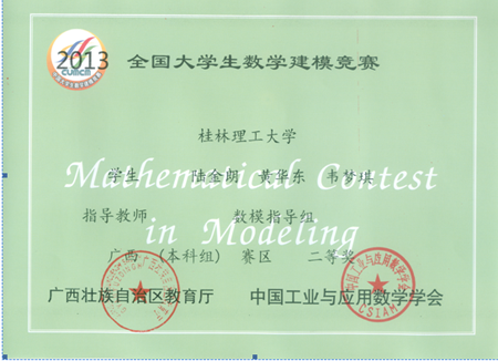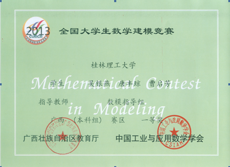 2013年高教社杯全国大学生数学建模竞赛广西区颁奖仪式于12月14日在北海隆重举行。由Beat365官网学生吴银燕、唐丰琼、曹启芳等72名同学组成的24个队参加了此次竞赛,Beat365官网学生最终获得广西一等奖1项,二等奖5项,三等奖8项。 全国大学生数学建模竞赛创办于1992年,每年一届,目前已成为全国高校规模最大的基础性学科竞赛,也是世界上规模最大的数学建模竞赛。2013年,来自全国33个省/市/自治区(包括香港和澳门特区)及新加坡、印度和马来西亚的1326所院校、23339个队(其中本科组19892队、专科组3447队)、70000多名大学生报名参加本项竞赛。