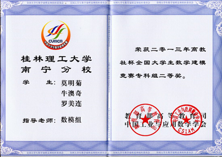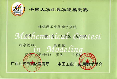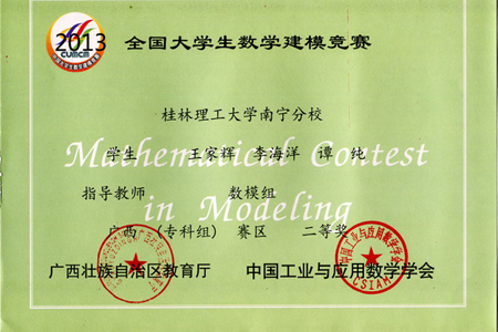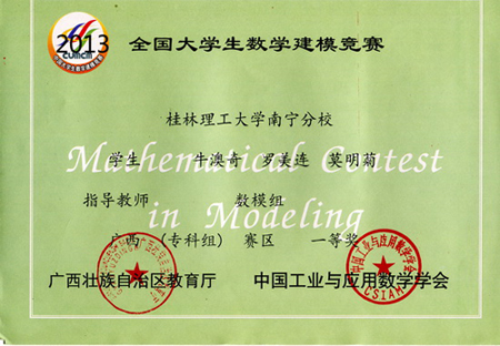 2013年高教社杯全国大学生数学建模竞赛结果已于日前揭晓。由Beat365官网高职学院学生组成的参赛团队喜获全国专科组二等奖1项,广西赛区专科组一、二、三等奖各1项。 全国大学生数学建模竞赛由教育部高等教育司和中国工业与应用数学学会联合主办,每年举办一届,是目前全国高校规模最大的基础性学科竞赛。举办该项竞赛,旨在激励学生学习数学的积极性,提高学生建立数学模型和运用计算机技术解决实际问题的综合能力,培养创造精神及合作意识。 一直以来,学校高度重视培养学生的应用技能,积极组织学生参加各级各类竞赛,并做好指导工作,取得了良好的参赛效果。