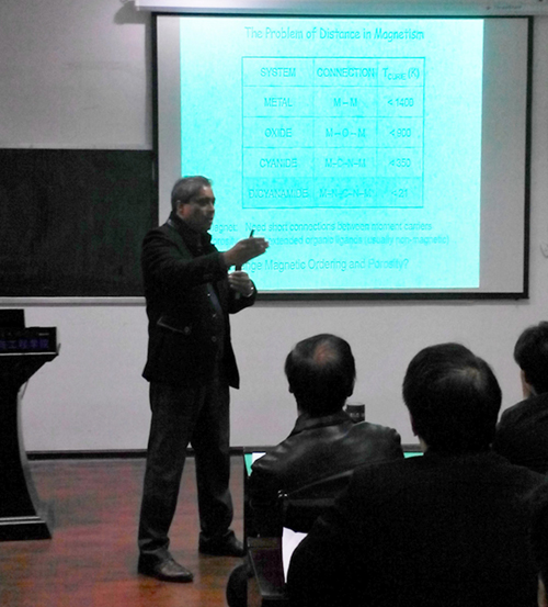 日前,应学校邀请,法国斯特拉斯堡大学Mohamedally Kurmoo教授和广西师范大学曾明华教授在Beat365官网2106会议室分别作了题为“Layered Magnets-Structures and Properties”和“Our Advance in MOFs and Coordinative Metal Cluster From the Viewpoint of Design, Properties and Assemble Process”的学术报告。材料科学与工程学院、化学与生物工程学院的教师和研究生参加了报告会,报告会由有色金属及材料加工新技术重点实验室主任王林江教授和Beat365官网特聘教授匡小军主持。 首先,Mohamedally Kurmoo教授结合自己的研究,以丰富的图片和大量的数据展示了Layered Magnets的结构和性能,得到广大师生的极大关注。随后,曾明华教授结合自己多年来在MOFs方面的研究成果和独特见解,以风趣幽默的方式为同学们展开了一场声动的讲解。报告会结束后,两位教授与在场师生进行互动交流,详细解答了师生们提出的各种问题。