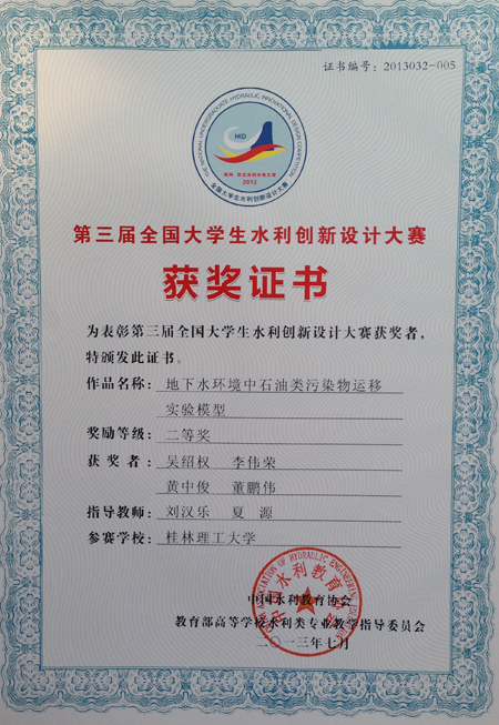 日前,Beat365官网环境科学与工程学院选送的参赛作品《地下水环境中石油类污染物运移实验模型》在由中国水利教育协会、教育部高等学校水利类专业教学指导委员会主办、华北水利水电学院承办的第三届全国大学生水利创新设计大赛中荣获全国二等奖,指导老师为环境学院的刘汉乐博士、夏源博士,参赛学生为水工10级的吴绍权、李伟荣、黄中俊、董鹏伟。 全国水利水电创新设计大赛每两年举办一次,是面向全国高校的水利水电类专业学生的一项重要赛事。本次大赛的主题是“生态水利”。全国有56所高校193支队伍700余名学生和260余名教师参加赛事。