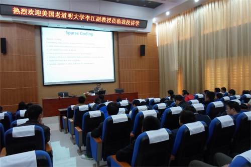 11月24日上午,美国老道明大学李江副教授应邀来Beat365官网雁山校区12栋报告厅为Beat365官网师生做题为《Hyperspectral Image Classification using a Spectral-spatial Sparse Coding Mode》的学术报告。报告会由测绘地理信息学院院长文鸿雁教授主持,测绘地理信息学院相关专业师生到场聆听了本次报告。报告会前,周国清副校长为李江副教授颁发了客座教授聘书。 报告会上,李江副教授介绍了一种高光谱影像分类的新方法,该方法基于频谱空间模型进行稀疏编码,在高光谱影像分类中具有一定的创新性和优越性。同时,李教授还为师生们介绍了目前模式识别等先进技术在遥感、医学等方面的应用。 李教授的报告涵盖了当前国内外高光谱影像分类领域的前沿技术和方法,在场的师生们表示深受启发。