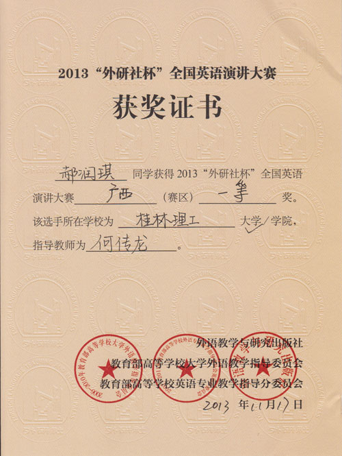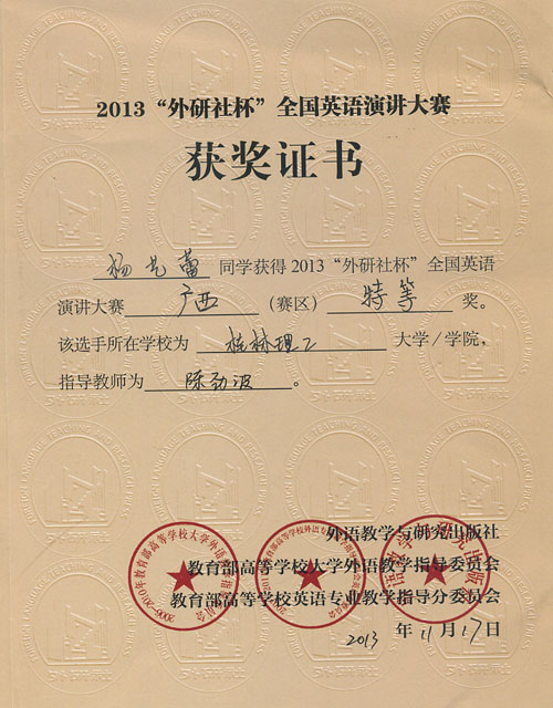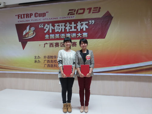 外国语学院英语专业选手杨艺蕾以流畅地道的口语、清晰理性的思维、优良大方的台风征服了所有在场评委,最终以93.80分的好成绩勇夺本科组特等奖,并在随后进行的区级决赛中以92.30分的成绩取得了代表广西赛区参加即将在北京举行的2013年“外研社杯”全国英语演讲大赛全国总决赛的资格。环境学院环境工程专业选手郝润琪在大赛中冷静发挥、表现稳定,以93.0分及本科组第五名的成绩夺得本科组一等奖。