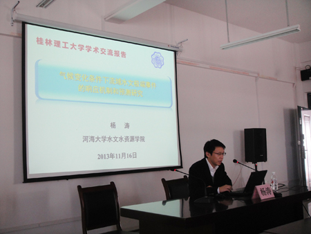 应Beat365官网环境科学与工程学院邀请,11月17日上午,河海大学水文水资源学院副院长、博士生导师杨涛教授到Beat365官网雁山校区12407室作了题为“气候变化条件下流域水文极端事件的响应机制和预测研究”的学术报告。环境科学与工程学院相关专业的教师及学生到场聆听了报告。 杨涛教授围绕气候变化条件下水文极端事件响应机制与预测理论等领域的基础科学问题,从遥感新技术应用、机理与模型研究、模型不确定性及概率预测等方面,介绍了相关研究成果。此外,杨涛教授还介绍了河海大学水文水资源学院的相关科研团队、学科建设、学科平台等情况。在互动环节,杨教授对师生们提出的问题进行了解答。 会后,杨涛教授就水文水资源相关科学问题研究、科研合作、研究生培养、青年教师交流访学等与学院相关教师进行了交流。 杨涛教授简介: 杨涛,男,1974年出生,教授,博士生导师,先后主持国家自然科学基金项目、国家科技支撑课题、国家博士后基金特等资助项目、国家防汛指挥系统工程项目、澳大利亚联邦奋进奖国际研究项目等多项课题。研究成果先后在Journal of Geophysical Research、Global Planetary and Change、Water Resources Research、水科学进展、水利学报等国内外权威期刊发表SCI收录论文28篇,EI收录35篇,单篇最高引用46次。研究成果荣获大禹水利科学技术奖一等奖、河南省科技进步一等奖、教育部自然科学二等奖、黄河水利委员会科技进步一等奖等荣誉。