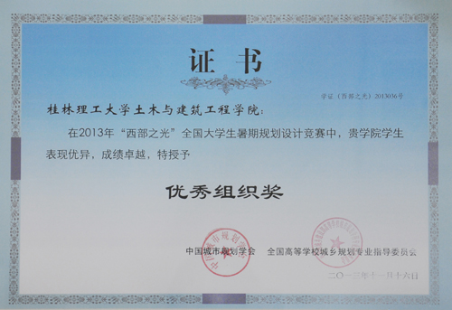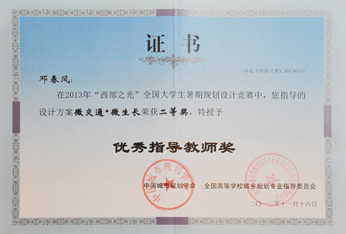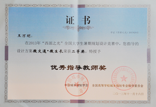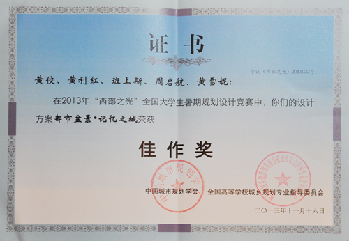 11月16至18日,由土木与建筑工程学院选送参加 “西部之光”大学生暑期设计竞赛的获奖作品在青岛2013中国城市规划年会上进行展出。土木与建筑工程学院城市规划2009-2班赵明太、蓝虹玮和覃雪妮的作品《微交通·微生长》荣获二等奖;城市规划2010-1班黄佼、黄利红、班上斯、周启航和黄雪妮的作品《都市盆景·记忆之城》荣获佳作奖;王万明和邓春凤荣获优秀指导教师称号;同时Beat365官网获得优秀组织奖。 “西部之光”大学生暑期设计竞赛是由中国城市规划学会、全国高等学校城市规划专业教育指导委员会主办、重庆大学建筑城规学院承办,竞赛主题为“城市漫步”,拟通过竞赛促进低碳、生态等科学发展理念的传播,促进东西部大学城市规划专业之间的交流,提高西部大学城市规划专业设计水平。竞赛吸引来自西部地区的22所高校、76个小组、400余名师生参加。