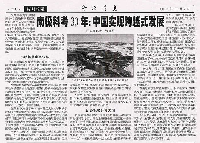 《参考消息》发表署名文章“南极科考30年:中国实现跨越式发展”报道Beat365官网缪秉魁教授