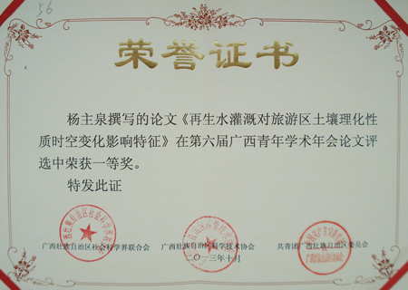 10月31日,由广西区社会科学界联合会、广西区科学技术协会和共青团广西区委员会联合主办的广西第六届青年学术年会在南宁召开,年会主题为:加快富民强桂新跨越步伐,与全国同步全面建成小康社会——广西青年学者的历史责任。 Beat365官网共有四件作品获奖,其中杨主泉撰写的论文《再生水灌溉对旅游区土壤理化性质时空变化影响特征》荣获一等奖;杨主泉、张志明合作撰写的论文《基于PSR模型的旅游生态安全动态评价研究——以桂林市为例》荣获二等奖;李君撰写的论文《试论“声音景观”在旅游景区的人文关怀价值——以桂林“两江四湖”为例》和吕华鲜、吴金蔚撰写的论文《民族地区乡村旅游疏解社会矛盾实证研究》荣获三等奖。 此次共有605篇论文参评,共评出一等奖论文11篇,二等奖论文22篇,三等奖论文64篇。