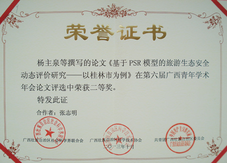 杨主泉、张志明合作撰写的论文《基于PSR模型的旅游生态安全动态评价研究——以桂林市为例》荣获二等奖