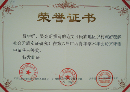 吕华鲜、吴金蔚撰写的论文《民族地区乡村旅游疏解社会矛盾实证研究》荣获三等奖