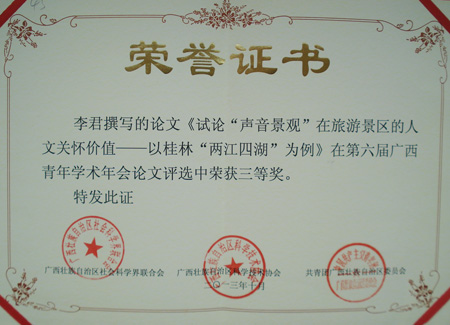 李君撰写的论文《试论“声音景观”在旅游景区的人文关怀价值——以桂林“两江四湖”为例》荣获三等奖