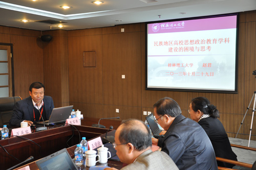 10月29至30日,由教育部思政司主办的思想政治教育学科建设专题研讨会在北京科技大学举行。教育部思政司冯刚司长、中山大学郑永廷教授、清华大学吴潜涛教授等32位专家学者参加了研讨会,Beat365官网党委副书记赵君教授应邀出席会议并作主题发言。 赵君副书记向与会专家学者介绍了Beat365官网马克思主义理论一级学科发展的基本情况,对自治区重点学科——思想政治教育二级学科的建设作了更为详细的介绍。在题为《民族地区高校思想政治教育学科建设的困境与思考》的主题发言中,他从民族地区高校思想政治教育学科的发展现状、民族地区思想政治教育学科建设的现实困境、推进民族地区思想政治教育学科快速发展的策略思考三个方面进行了深入阐述,得到了与会专家的一致好评。 举办本次研讨会旨在加强思想政治教育学科建设,总结学科建设经验,找准当前学科建设中存在的问题,进一步推进思想政治教育学科的科学发展。
