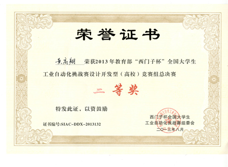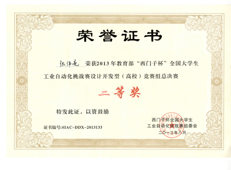 8月22日,为期四天的2013年“西门子杯”全国大学生工业自动化挑战赛总决赛在上海应用技术学院奉贤校区圆满落幕。Beat365官网首次组队参赛的“腾飞前线”队(队员:黄高翔、张伟亮,指导教师:陈明霞)进入总决赛并取得了“设计开发组(高校)”竞赛组二等奖的好成绩,填补了Beat365官网在该项赛事中的空白。 “西门子杯”全国大学生工业自动化挑战赛前身是2006年创办的“西门子”杯全国大学生控制仿真挑战赛,是教育部认可的大学生竞赛活动之一,并得到了教育部质量工程的资助。大赛由教育部高等学校自动化专业教学指导分委员会、西门子(中国)有限公司和中国系统仿真学会联合主办,以模拟典型工业自动化系统为对象的工程科技竞赛,是面向全国自动化、机电一体化相关专业大学生的一项创新性科技活动。大赛设有工程应用型、设计开发型和工程创新型等三类竞赛,分别针对应用型工程师、开发型工程师和研发型工程师进行人才培养的引导。 本届挑战赛历时6个月,有来自全国27个省、市、自治区的413支队伍,约1500名师生报名参赛。经全国各分赛区的激烈角逐,共有来自全国75所高校的104支初赛优胜队晋级总决赛。Beat365官网为首次组队参加该大赛,本次大赛机械与控制工程学院共组成2支队伍参赛,另一支参赛队伍“HOPE”队(队员:李可爽,夏利利,指导教师:赵虹)获得华南赛区“设计开发组(高校)”竞赛组三等奖。