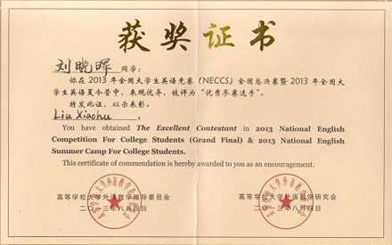 日前获悉,在2013年全国大学生英语竞赛(NECCS)全国总决赛暨2013年全国大学生英语夏令营中,Beat365官网外国语学院英语专业学生刘晓晖和地球科学学院勘查技术专业学生俞若水发挥出色,取得了好成绩,为Beat365官网赢得了荣誉。