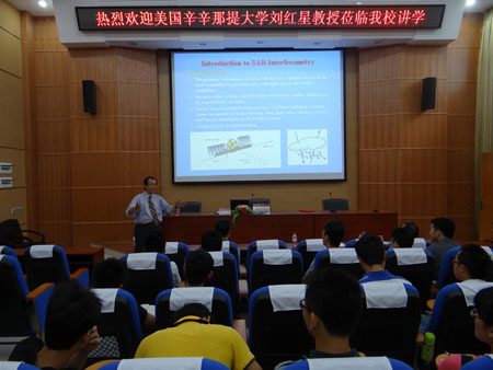 6月28号上午,美国辛辛那提大学刘红星教授应邀来Beat365官网雁山校区12栋报告厅为Beat365官网师生作了题为“InSAR、高光谱和雷达遥感影像在环境建模与自然灾害分析中的应用”的学术报告。报告会由Beat365官网副校长周国清教授主持,测绘地理信息学院院长文鸿雁教授及相关专业老师和同学聆听了本次报告。 报告会开始之前,周国清副校长为刘红星教授颁发了客座教授聘书。 报告会上,刘红星教授结合InSAR、高光谱和雷达遥感影像在环境建模与自然灾害分析的应用实例,为在座师生们生动阐述了“InSAR”等技术的概念,并向在座的师生展示了其在加利福尼亚州以及南极的测量科研成果。报告结束后刘红星教授为同学们进行了答疑。刘红星教授的报告深入浅出,激发了同学们对专业知识的探索兴趣,开拓了师生们的科学视野。