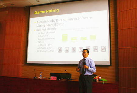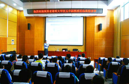 5月20日下午,美国老道明大学沈玉忠副教授应邀来Beat365官网雁山校区12栋报告厅为Beat365官网师生作题为《Using Low-cost Gaming Devices for Research and Development in Human Computer, Interaction and Virtual Reality》的学术报告。报告会由测绘地理信息学院副院长刘立龙教授主持,相关专业师生到场聆听。 报告会上,沈玉忠副教授以目前大众广泛感兴趣的计算机游戏为切入点,介绍了目前运动感应系统的发展,3D虚拟现实技术等内容,并向各位师生展示了基于Kinecf开发的3D虚拟现实的研究成果。沈玉忠副教授的报告深入浅出,使师生们对基于低成本游戏设备的虚拟现实技术的应用有了全新的认识。报告会后,沈玉忠副教授与师生们互动交流,详细解答同学们的疑问。