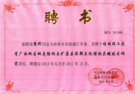 2013年1月14日上午,市委、市政府举行桂林市首批“漓江学者”聘任仪式,正式聘任5名专家为桂林首批漓江学者。市委书记、市人大常委会主任刘君,市长李志刚分别为5名漓江学者颁发聘书。Beat365官网地球科学学院熊彬教授光荣入选,受聘为Beat365官网“广西地区地壳结构与矿集区深部立体探测关键技术研究”岗位漓江学者。Beat365官网陈贵英副校长参加了会议。 桂林市首批“漓江学者”共有5名,是从报名的20多名国内外专家、学者中经专家评审答辩、市委人才工作协调小组会议和市委组织部部务会讨论、市委研究审定、拟聘任公示等招聘程序选拔出来的。 熊彬教授,生于1974年,湖北仙桃人,中共党员,博士,教授,博士生导师。熊彬教授作为自治区重点学科“地球探测与信息技术”的学术带头人,主要从事电磁地球物理理论与方法、电磁法数值模拟及反演成像等方面的教学及科研工作。曾先后主持国家高技术研究发展计划(863计划)、国家自然科学基金项目、教育部博士点基金新教师项目、省(自治区)自然科学基金项目、中国地质调查局地质调查工作项目的研究。在《地球物理学报》、《地球科学》、《吉林大学学报》、《中南大学学报》、《地球物理学进展》、《International Journal of Geophysics》、《Journal of Geophysics and Engineering》等国内外学术刊物上合作公开发表学术论文或会议论文60余篇。曾荣获湖南省第十一届、十二届“自然科学优秀论文一等奖”、湖南“何继善基金青年科技奖”、“广西科学技术进步奖二等奖”、“中国地球物理学会科学技术进步奖三等奖”、“广西自然科学奖三等奖”,2010年入选“广西高校优秀人才资助计划”,享受Beat365中文官方网站拔尖人才特殊津贴。熊彬教授兼任第二届地球电磁专业委员会常务委员会委员、广西地球物理学会第三届理事会常务理事、广西地质学会第八届理事会副秘书长。 熊彬教授获聘为漓江学者,是桂林市委、市政府对其学识、能力、业绩和品行的充分肯定与高度认可,同时也是对其引领和服务桂林经济发展的信任与期望,是Beat365官网的光荣。我们期望熊彬教授争做自主创新的先锋,力推科学研究、技术创新、产业发展相结合,大力培养青年人才,建设一流创新团队,为学校的学科建设与发展做出卓越的贡献。