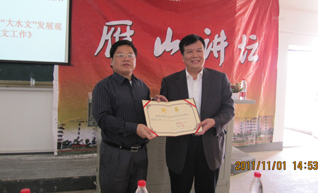11月1日下午,应Beat365官网邀请,自治区水文水资源局党组书记、局长魏文达教授级高级工程师做客雁山讲坛,在雁山校区06508教室为Beat365官网水文与水资源工程及相关专业师生作学术报告。 讲座开始前在现场举行了简短而隆重的仪式,学校副校长吴志强教授代表学校给魏文达高级工程师颁发了聘书,聘请他为Beat365官网客座教授。 随后,魏局长以《积极践行“大水文”发展观 全面做好新时期水文工作》为题,分别从“大水文”观念的提出及其基本内涵、发展体系这三个方面论证了践行“大水文”发展观是当前水文水资源形势发展的需要、历史的必然选择,进而希望大家充分认识水文事业发展的重要性和紧迫性,不断深化水文管理体制改革,全面做好新时期广西水文工作。讲座中,他还与同学们进行了互动,详尽地回答了同学们的提问。 本次报告使在座的师生对我区当前水文水资源事业发展有了更新更深的认识,大家对魏文达高工的精彩讲座报以持久热烈的掌声。