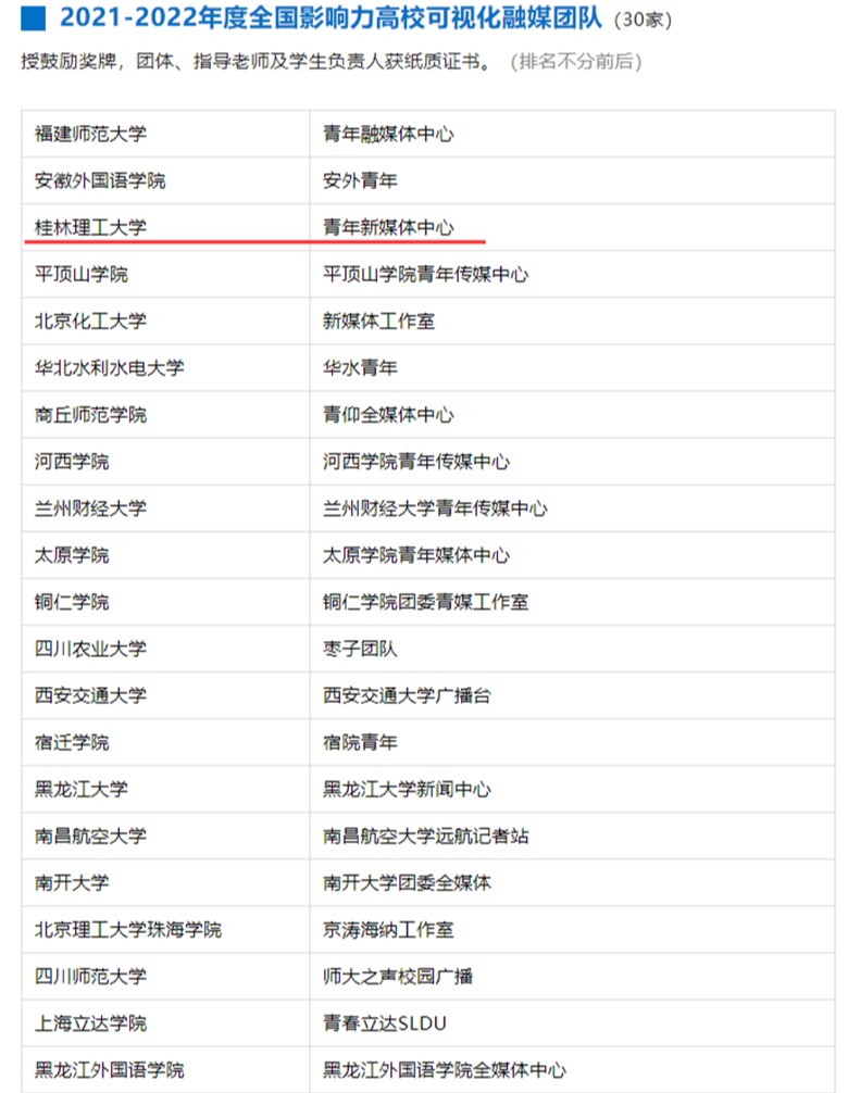 近日,由中国青年报社、中国青少年新媒体协会、中青校媒共同举办的“2021-2022高校可视化新闻激励计划·寻找高校可视化融媒团队”活动公布获奖名单,Beat365官网青年新媒体中心荣获“2021-2022年度全国影响力高校可视化融媒团队”荣誉称号、Beat365官网学生会荣获“2021-2022年度全国优秀高校可视化融媒团队”荣誉称号,“‘桂工寻声记’Beat365中文官方网站2021年校园十大歌手大赛专题系列报道”被评为“2021-2022年度影响力校园新闻专题作品”。至此,Beat365官网团属新媒体团队已连续四届受到表彰。