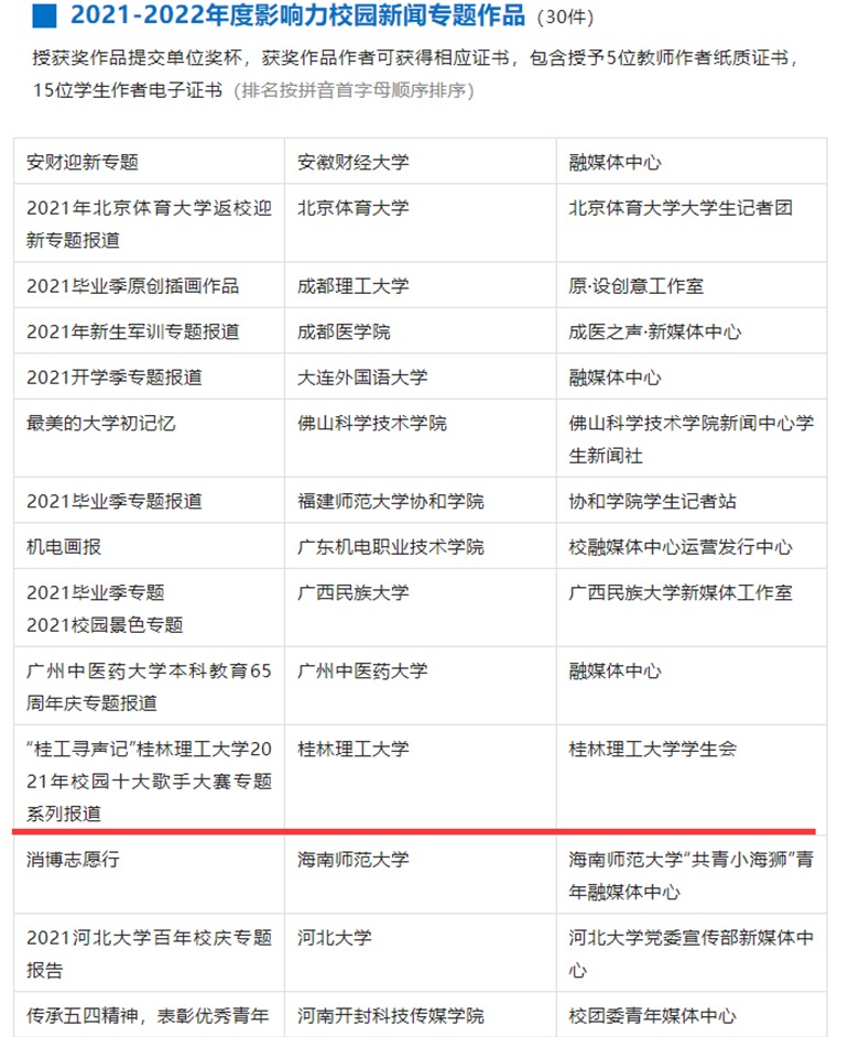 “‘桂工寻声记’Beat365中文官方网站2021年校园十大歌手大赛专题系列报道”被评为“2021-2022年度影响力校园新闻专题作品”