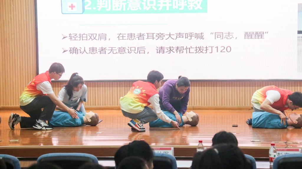 活动上,桂林医学院临床医学院师生向大家呈现了精彩的抗疫人物事迹朗诵,为同学们介绍了高校师生急救知识与技能,以及心肺复苏的正确操作相关内容,指导学生在面对现场急救时的反应与操作。活动过程中还邀请在场师生上台体验现场急救处理的教学,对得分较高的三位同学给予嘉奖。