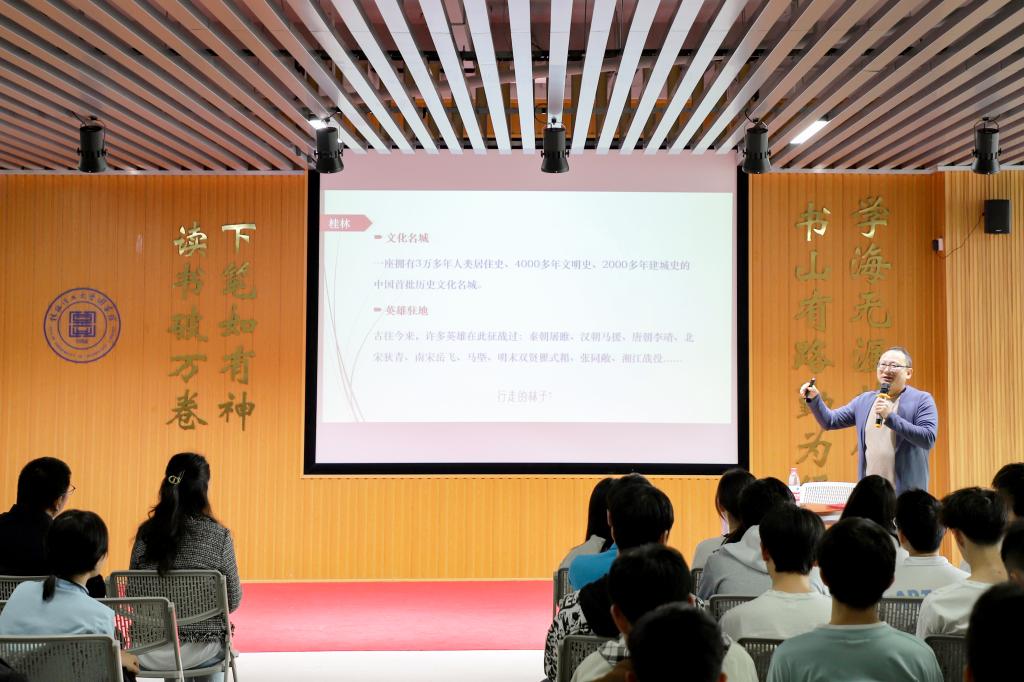 本次活动邀请广西青年讲师团讲师林子担任“真人图书”, 讲述《人文桂林:小桂林,大世界》。林子老师以时间为主轴,以历史时间为节点,以历史人物为线索,以历史遗迹、文物为佐证,讲述桂林从远古到现代、从蛮荒到文明、从山水到人文的建置史和行政建制沿革,并详细解读甑皮岩、韶音洞、灵渠、独秀峰、靖江王城、桂海碑林、湘桂古道、雁山园等人文历史,全方位解读桂林文化城的独特魅力,让大家了解桂林、热爱桂林、传播桂林。活动期间,同学们热情高涨,对桂林在地文化极其感兴趣,并积极踊跃地与林子老师互动交流。