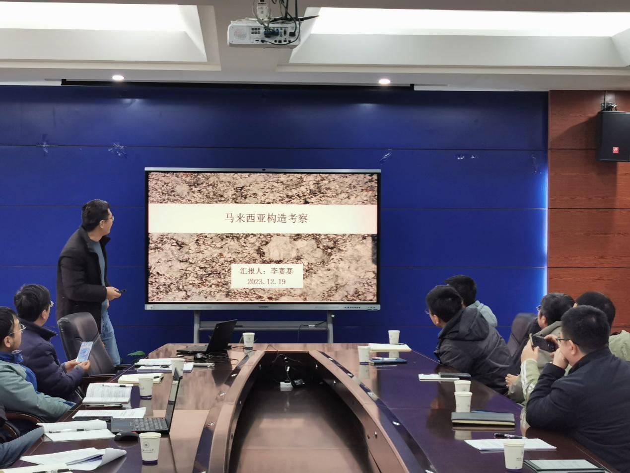 考察团负责人付伟教授系统汇报了在马来西亚考察期间的主要活动,对所考察的7个矿床矿点进行了详细介绍,初步总结了目前取得的研究成果,并对关键科学问题和后续工作进行了说明和展望。考察团成员李赛赛教授汇报了构造地质学方面的研究工作和进展情况,结合野外实地观测现象和已有资料,介绍了马来西亚的构造背景,详细阐述了马来西亚关键构造带的区域构造特征和矿田构造特征,对后续工作进行了规划。考察团成员吴浩副教授介绍了岩石学方面的研究进展。