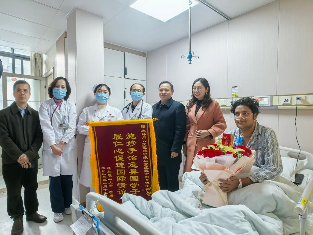 期间,学校副校长周国清专程到医院看望慰问了沙加尔,详细询问其身体状况,叮嘱他安心养病,早日康复。周国清还代表学校向桂林市人民医院赠送了写有“施妙手治愈异国学子,展仁心促进国际情谊”的锦旗,对医院的救治工作表示高度赞扬和诚挚感谢。
