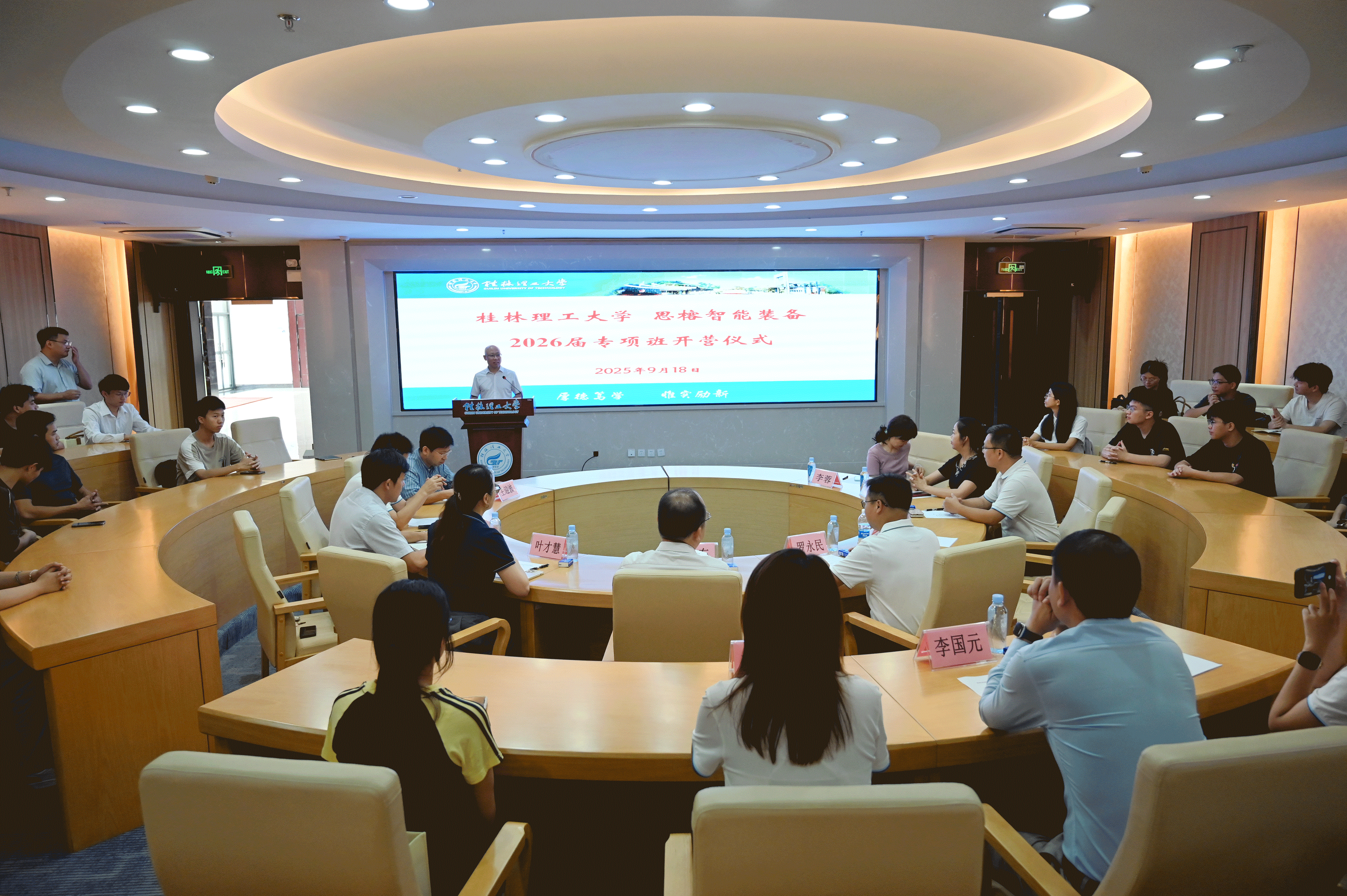 9月18日上午,思榕智能装备董事长罗永民一行在Beat365官网雁山校区开展2026届校园招聘专项培训班。学校党委常委、副校长唐壮东出席开班仪式并讲话,学工部(处)、计算机科学与工程学院、机械与控制工程学院、外国语学院相关负责人参加开班仪式。
