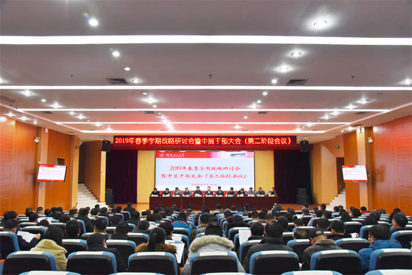 2月26日,新学期开学第二天,学校在雁山校区举行为期一天的2019年春季学期战略研讨会暨中层干部大会,学习传达全区教育大会、全区高校党建工作会议、全区教育工作会议精神,总结学校2018年工作,研究部署新一年和新学期各项工作。校领导李国忠、解庆林、王赣华、吴志强、孙宁、陈学军、王玫、周国清、梁福沛、王敦球、曾繁荣、张劲松出席大会。全体中层干部参加会议。