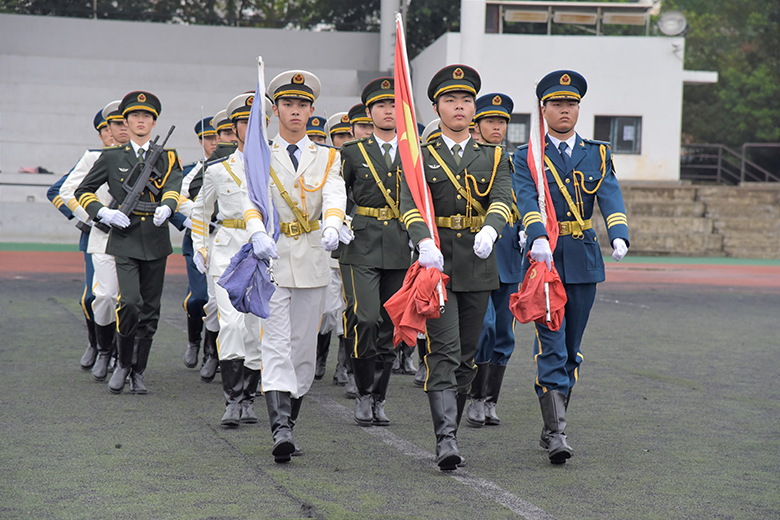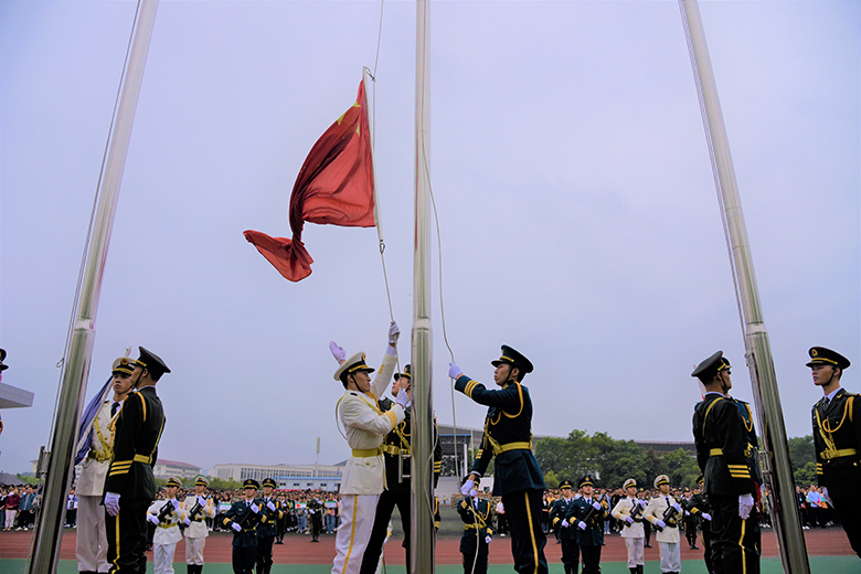 在全场师生的注目礼下,英姿飒爽的国旗护卫队队员们迈着整齐的步伐,护送鲜艳的五星红旗进场。伴随着庄严雄壮的中华人民共和国国歌的奏响,鲜艳的五星红旗缓缓升起,全场师生肃立,凝视着飘扬升起的五星红旗,表达对祖国无限热爱和崇高的敬意。