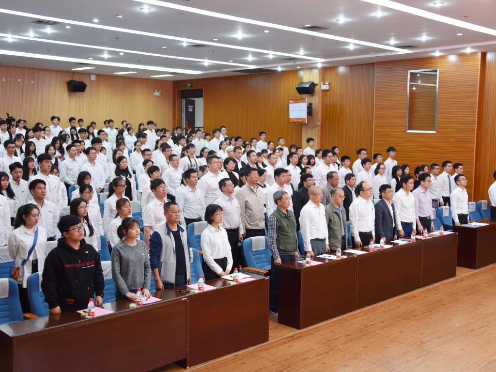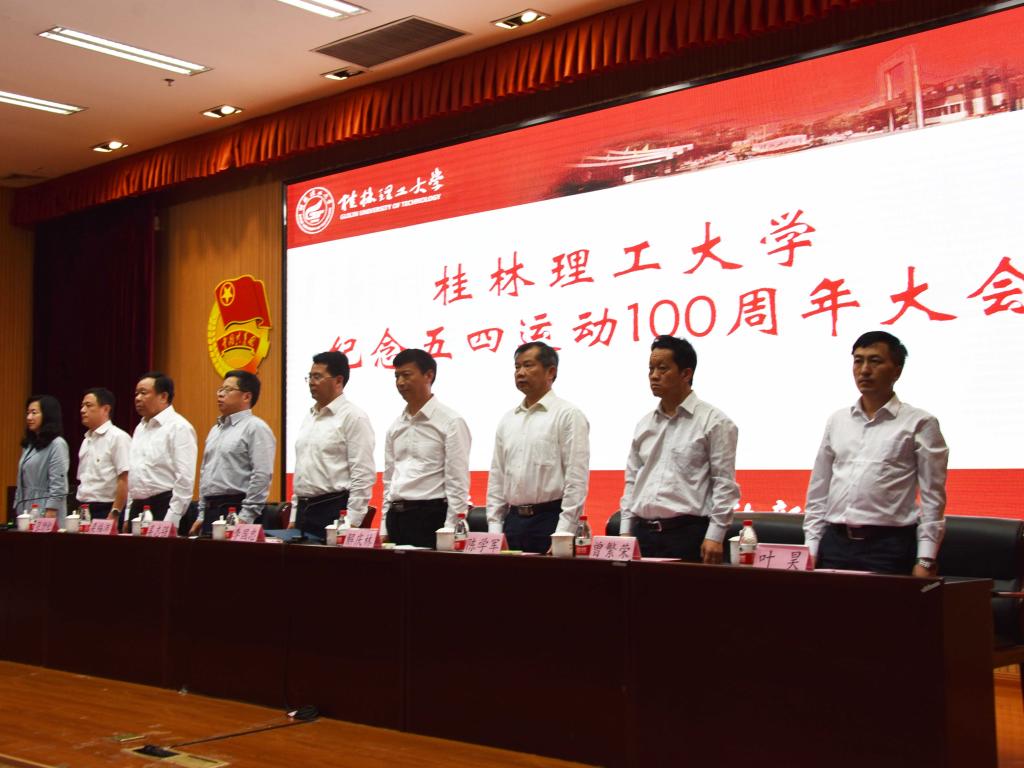为隆重纪念五四运动100周年,深入学习贯彻习近平总书记在中央政治局第十四次集体学习时的重要讲话精神,4月30日下午,学校在雁山校区图书馆报告厅举行纪念五四运动100周年大会。在家校领导李国忠、解庆林、吴志强、陈学军、梁福沛、曾繁荣、张劲松出席活动。学校党办校办、宣传部、统战部、学工部(处)、研究生工作部、党委教师工作部、教务处、科技处、工会、团委等职能部门主要负责人,各学院党委书记、副书记、团委书记、团员代表300余人参加了纪念活动。会议由副厅级调研员张劲松主持。