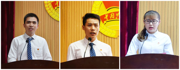 全区优秀共青团干部夏勇超(左),校团委学生副书记高昌洪(中),研究生支教团团长张雅祺(右)分别发言